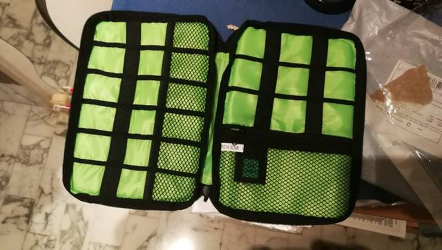Dear friends, This is a useful high tech storage product, and matches the listing description. Good quality material, the stitching is clean, and I like that they finished the cuts and joined ends with ribbon/pipping to keep it from fraying. It is a soft case, with lots of pockets and straps to organize tech stuff and it zips up well. My only caveat would be that one side of straps where a different (larger) length to accommodate the size of a AC USB adapter or longer cables. Regardless I am happy with this purchase, and will be using this case to store and organize necessary tech items for my next trip. Also, the price to product ratio, for what you get is very good. Good store, and responds well to messages. For example, asking about the BP expiring before the product arrived, and no problem, as the seller extended it quickly in response. I can recommend this storage case, the store and a good seller, who cares about customers and products. Thank you